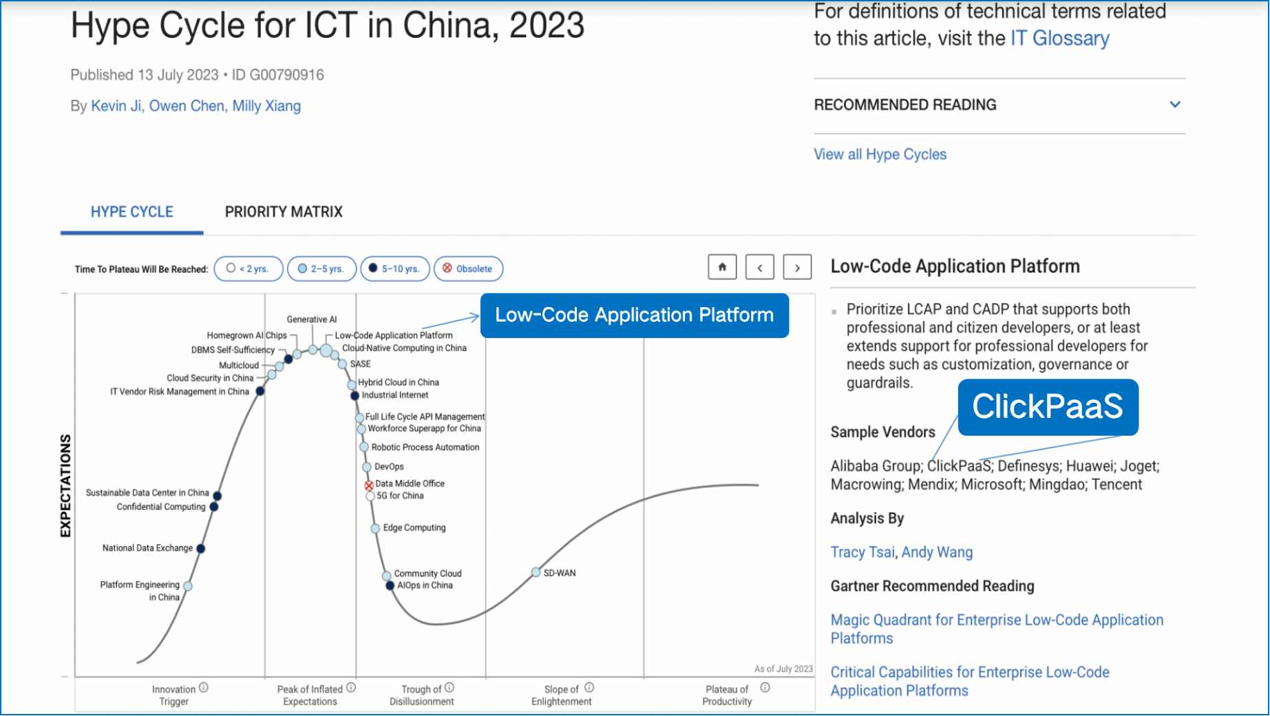 近日,国际权威研究机构Gartner发布了《Hype Cyple for ICT in China,2023(2023年中国ICT技术成熟度曲线)》报告,金年会娱乐官网下载凭借平台的aPaaS+iPaaS+DaaS保障业务系统的一站式设计,多租户、热发布、国际化、信创安全等特性实力登榜,并作为低代码PaaS平台代表厂商TOP2入选本次报告。